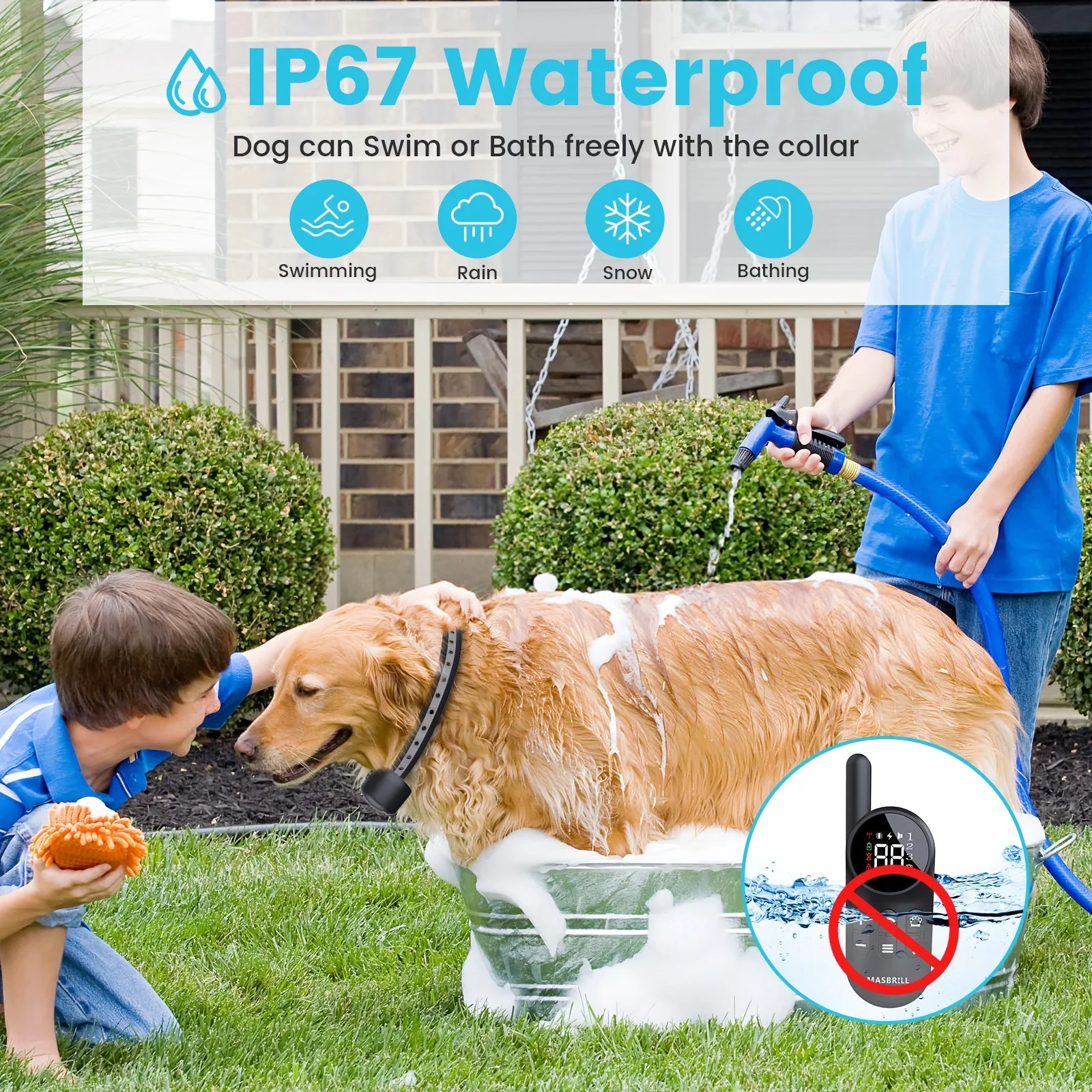 - IPX7 Waterproof & Long-Distance Control Designed as a durable dog e collar, its waterproof receiver withstands rain, swimming, and muddy play (remote not waterproof). With an impressive 1000ft range, this pet shock collar for big dogs gives freedom while maintaining control – perfect for open spaces where standard shock collars fail.