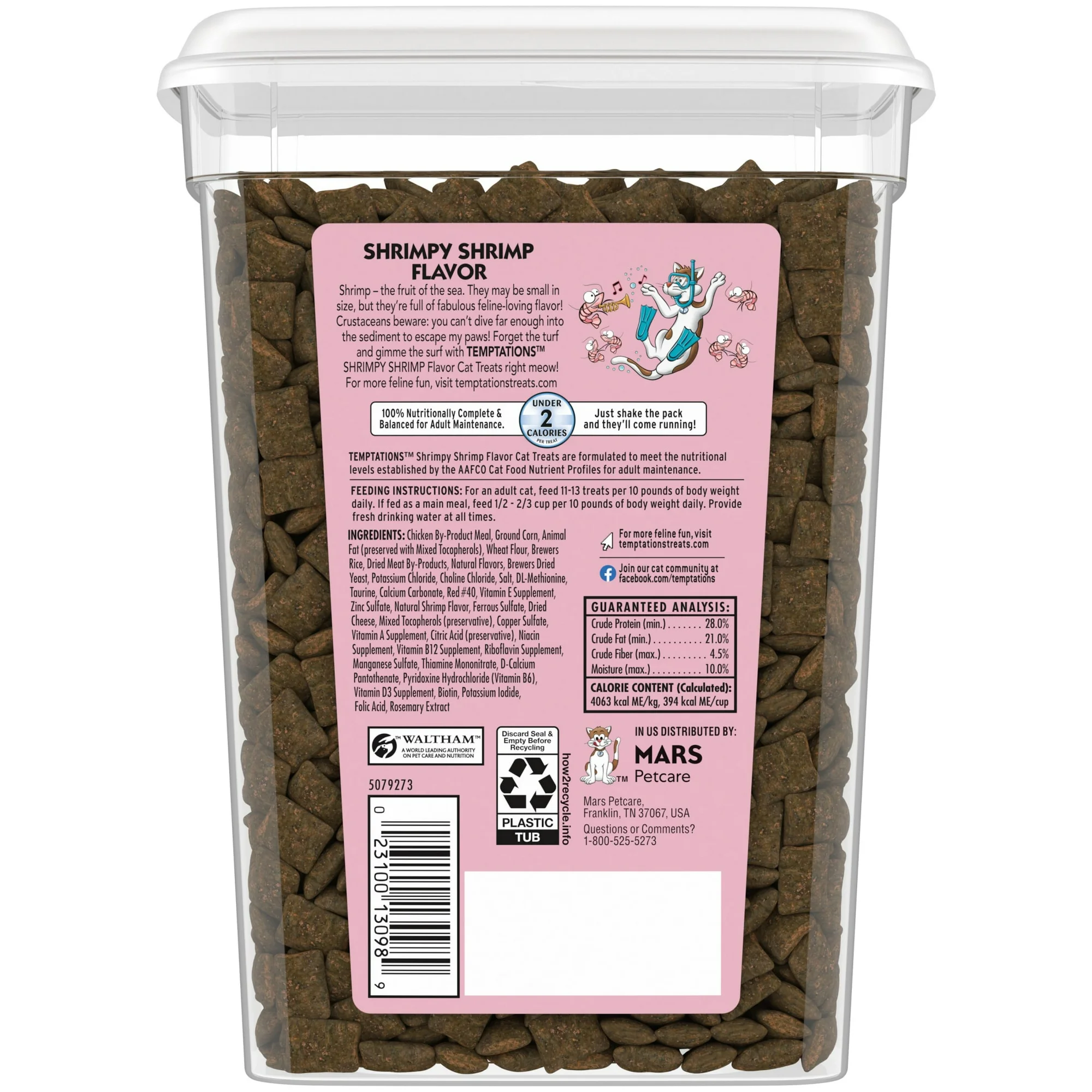 Contains one (1) 16 oz. tub of TEMPTATIONS Classic Cat Treats Shrimpy Shrimp Flavor