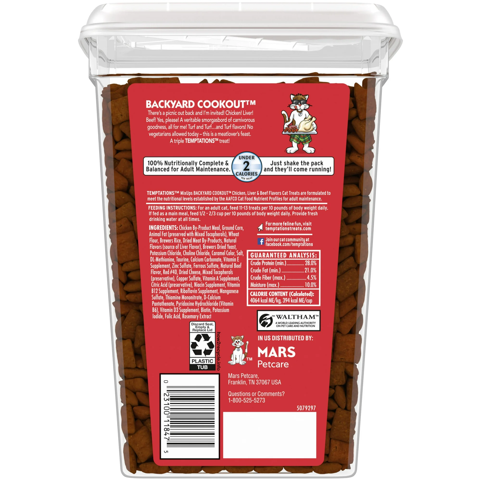 Temptations Mixups Backyard Cookout Flavor Crunchy And Soft Dry Cat Treats, 30 Oz Tub: Did your fussy feline greet you with a chorus of purrs when you got home? Reward your cat with a mix-n-match of their favorite playtime cat treats. Temptations MixUps Backyard Cookout is a trifecta of tempting treats with a mix of chicken, liver, and beef flavors. Each of these tasty cat treats has less than 2 calories and provides an irresistible combination of both crunchy and soft textures. They’re excellent-sized treats for cat toys, so try placing a few inside a treat dispenser toy and watch your furball chase and swat away. Temptations MixUps comes in a resealable, Super Value-sized tub, so your fur-friend can enjoy their favorite cat treats when you open it… but not when they shouldn’t! Temptations MixUps are the purr-fect crunchy and soft cat snack to show your feline friend how much you care.