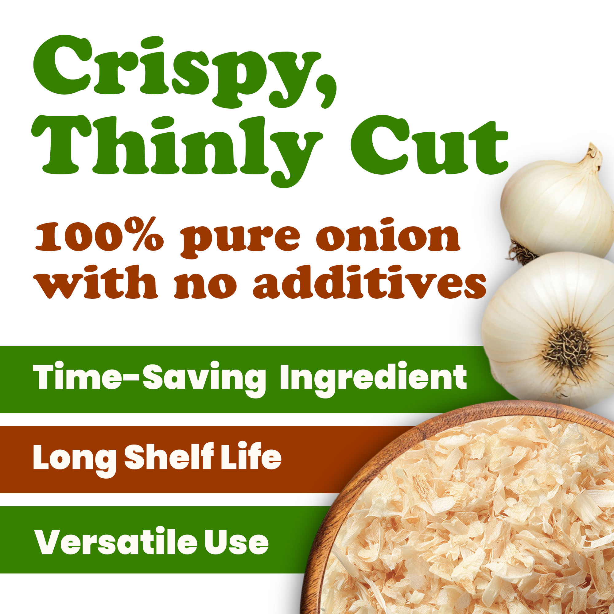 Perfect for soups, stews, casseroles, and dry seasoning blends, these toasted onions bring bold flavor to a wide range of dishes. Add directly to recipes during cooking or rehydrate them in warm water for use in sauces and marinades. They also make an excellent garnish for baked potatoes, salads, and savory pastries, offering both taste and texture with no extra prep.